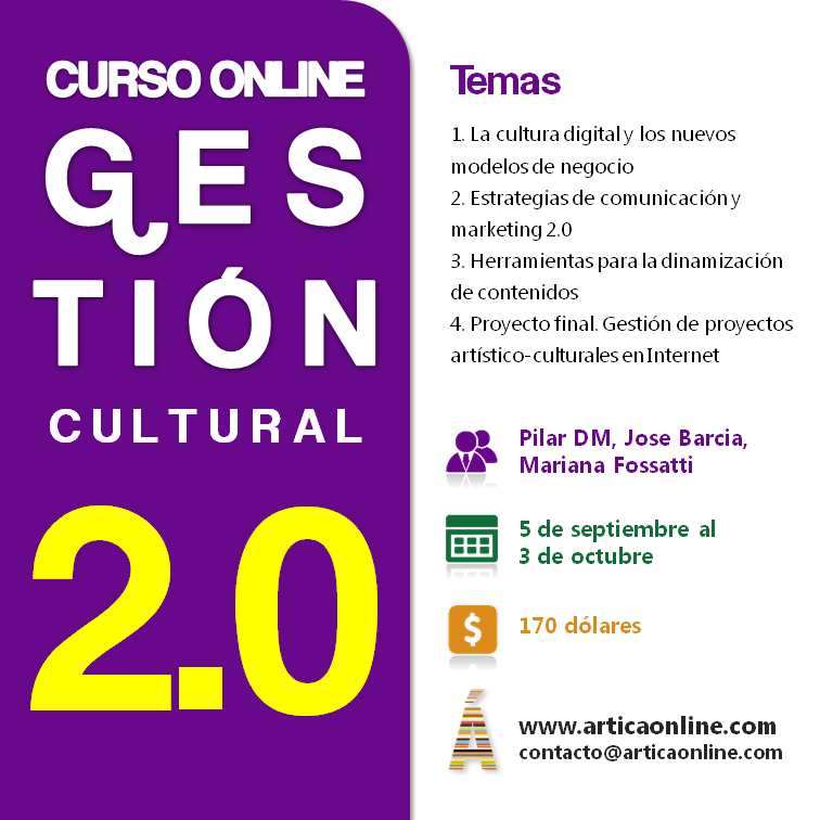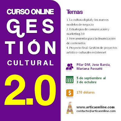 1. Gestión Cultural 2.0, será la III edición de este curso donde comparto docencia con Mariana Fossatti y José Barcia. La verdad es que es un lujo dar este curso, por lo que aprendemos entre el equipo docente, el rico intercambio de preguntas y sugerencias que realizan los alumnos en los diversos foros y por los increíbles proyectos finales que nos toca evaluar :-)