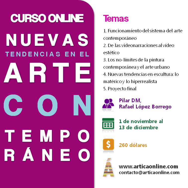 4. Nuevas tendencias del arte contemporáneo. Este curso surge de un deseo. Quería hacer un curso donde formalizar algunos contenidos presentados en el blog, junto con otros en los que, por tiempo, no había podido profundizar pero además, hablar de los artistas y las tendencias que existen hoy día. La idea fue aprobada por el equipo de Ártica por lo que solicité a Rafael López que se sumará al proyecto para que, como gran profesional del mundo del arte contemporáneo y los museos, aportará también toda su "sapienza" en este viaje por el arte contemporáneo que comienza el 1 de noviembre.