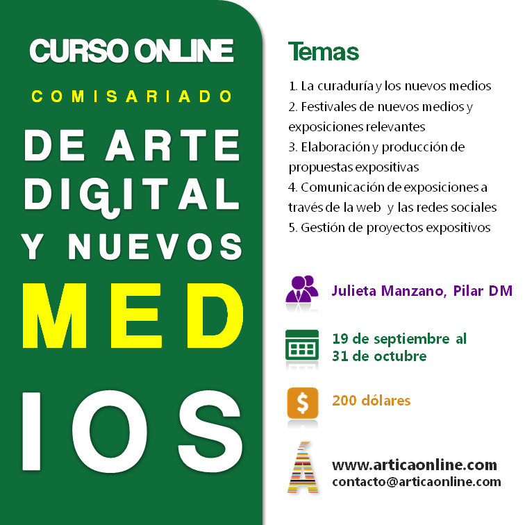 Sin duda, un curso para aquellas personas que quieren por un lado saber más sobre las nuevas tendencias en arte digital y el conocido como arte de los nuevos medios, y por otro lado descubrir cómo hoy día pueden comunicar sus propuestas en la red. Si es tu caso, entra aquí. ¡Comenzamos el 19 de septiembre!