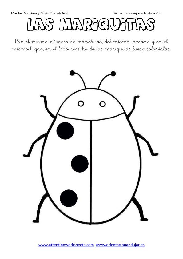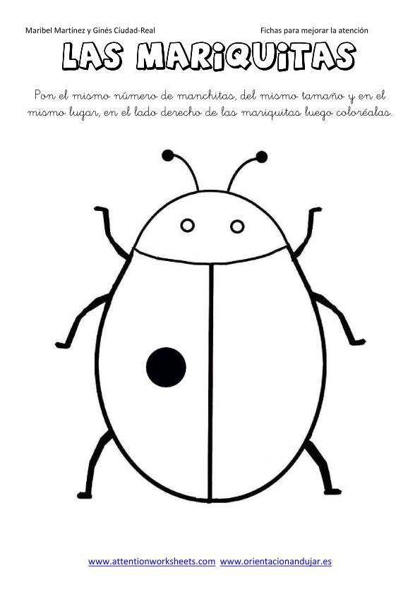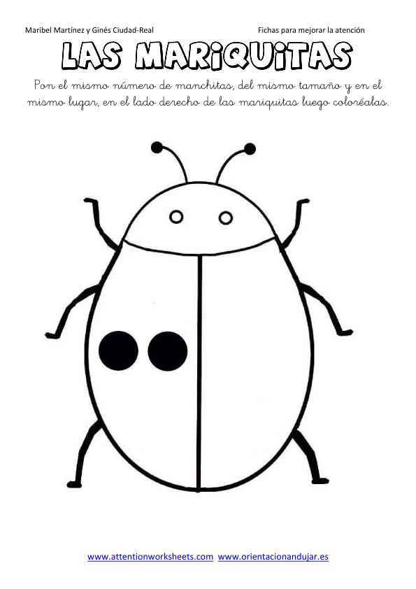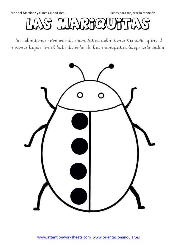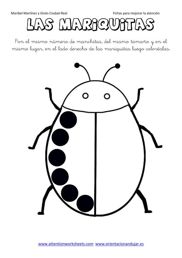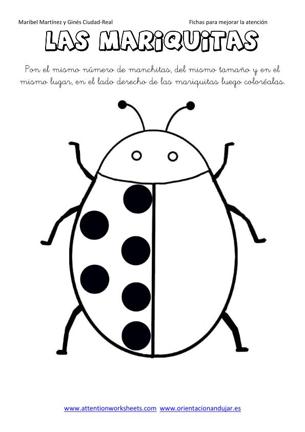 Estas primara actividad vamos a trabajar la lateralidad derecha. En esta fichas los niños/es deben de poner el mismo número de manchitas, del mismo tamaño y en el mismo lugar, en el lado derecho de las mariquitas y para darle un toque más lúdico y finalizar las ficha tienen que colorear la mariquita una vez que han completado las manchitas en el lado derecho.