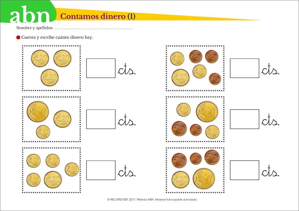 Fran publicó:"Buenas tardes :) En esta entrada tenéis dos fichas donde el alumno tendrá que contar y escribir cuántos céntimos hay en cada caso. FICHA 1 [DESCARGAR PDF] FICHA 2 [DESCARGAR PDF] Un saludo, RECURSOSEP."